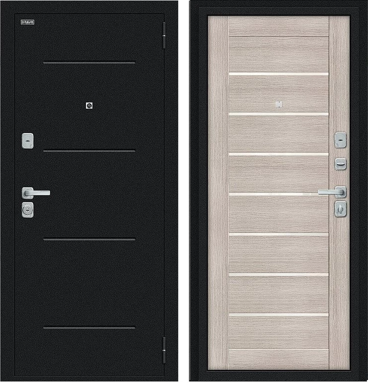Надежная входная Дверь Браво Техно/BChrome Букле черное/Cappuccino Melinga премиум класса по цене 34 459 руб. Большая толщина стали защитит от проникновения в ваш дом, квартиру или коттедж. Используется очень качественная фурнитура: замки, цилиндры, ручки, защелки. Покрытие и отделка двери изготовлено под внимательным контролем производителя. Дверь имеет долгий срок службы и гарантию.